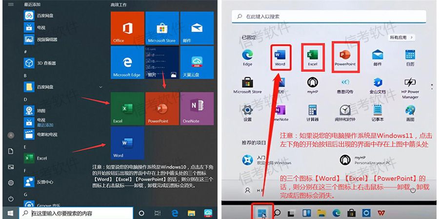 3、注意:如果說您的電腦操作系統(tǒng)是Windows10/11,點(diǎn)擊左下角的開始按鈕后出現(xiàn)的界面中存在上圖中箭頭處的三個(gè)圖標(biāo)【W(wǎng)ord】【Excel】【PowerPoint】的話,則分別在這三個(gè)圖標(biāo)上右擊鼠標(biāo)——卸載,卸載完成后圖標(biāo)會(huì)消失。
