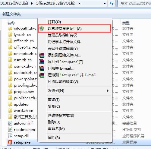 5、打開(kāi)文件夾“Office2013(VOL版)”,找到里面的“setup.exe”,右擊—以管理員身份運(yùn)行。