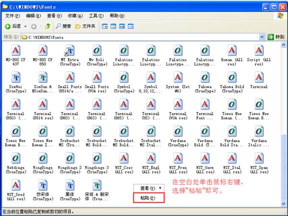 5、打開“Fonts文件夾”,在空白處單擊鼠標(biāo)右鍵,選擇“粘帖”即可。