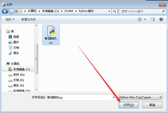 5.選中新冠肺炎.py,然后點(diǎn)擊箭頭處的打開。